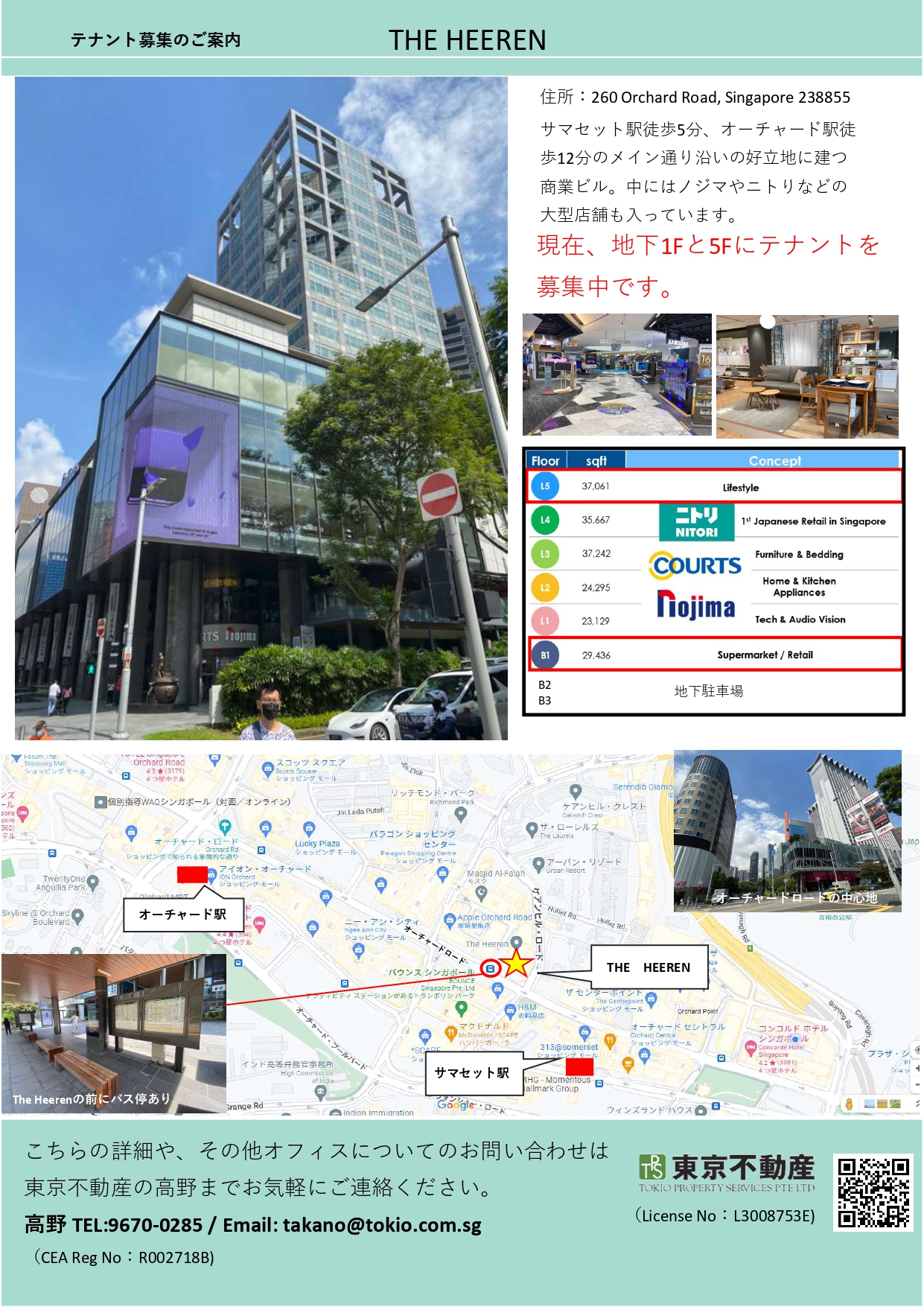 The HeerenはCOURTS NOJIMAの商業ビルで、サマセット駅から徒歩5分、オーチャードロードの中心地にある大変人気の物件です。